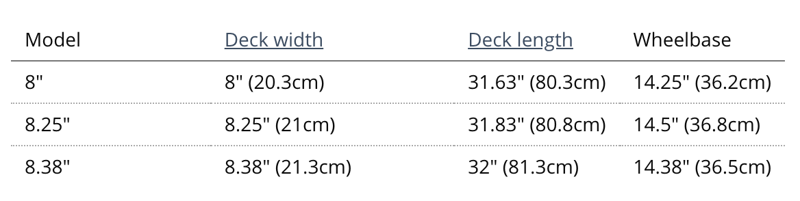 The size chart for my Toy Machine Deck below- I got the 8.38”, you can see it’s longer with a longer Wheelbase than the 8” version.